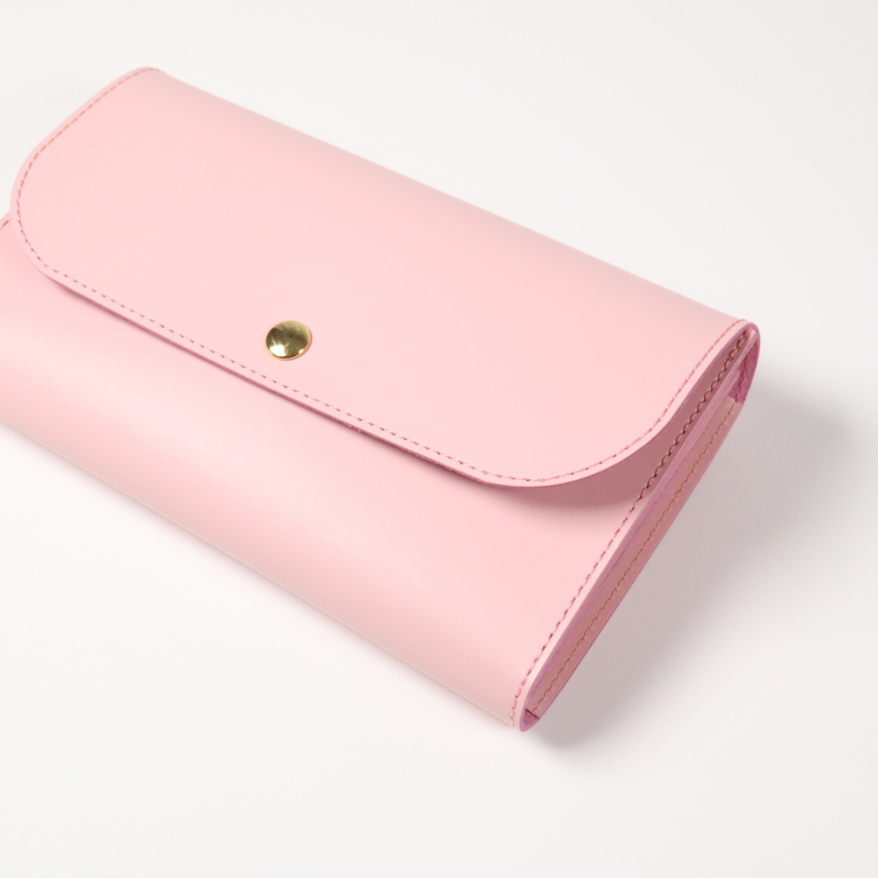 通帳と印鑑と紙幣100枚(封筒ごと)が収納できる、便利なケースです。さくら色の可愛らしいデザインで、持ち運びもしやすいサイズ感です。荷物が増えがちな日常でも、スッキリと整理ができるアイテムとなっています。